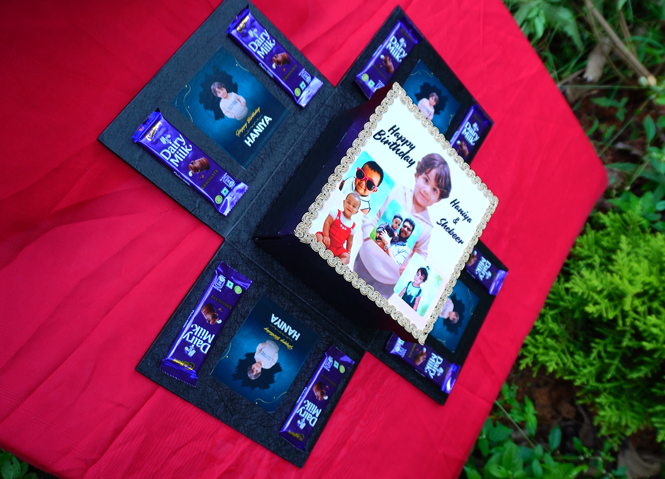 Make birthdays unforgettable with our beautifully handcrafted Personalized Explosion Box Hamper 💝. This premium gift box opens into a stunning surprise filled with custom photos, Dairy Milk chocolates, sweet treats, and a cute soft toy, making it perfect for kids and loved ones.